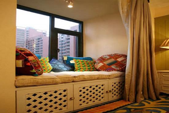 轻薄纱窗+灰色遮光帘--营造出温馨舒适角落,漫享舒适阳光的同时还能保持一份私密;隐形收纳工具--飘窗接近地面部分做了巧妙处理,能坐能躺还能下端收纳各种私物。